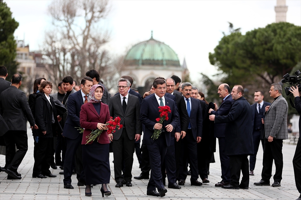 Photo: Turkish Prime Minister Ahmet Davutoglu (R) and his wife Sare Davutoglu (L) leave roses for the ones who lost their lives in an attack at Sultanahmet square after it has been reopened to media and public in Istanbul, Turkey on 13 January, 2016 (AFP).