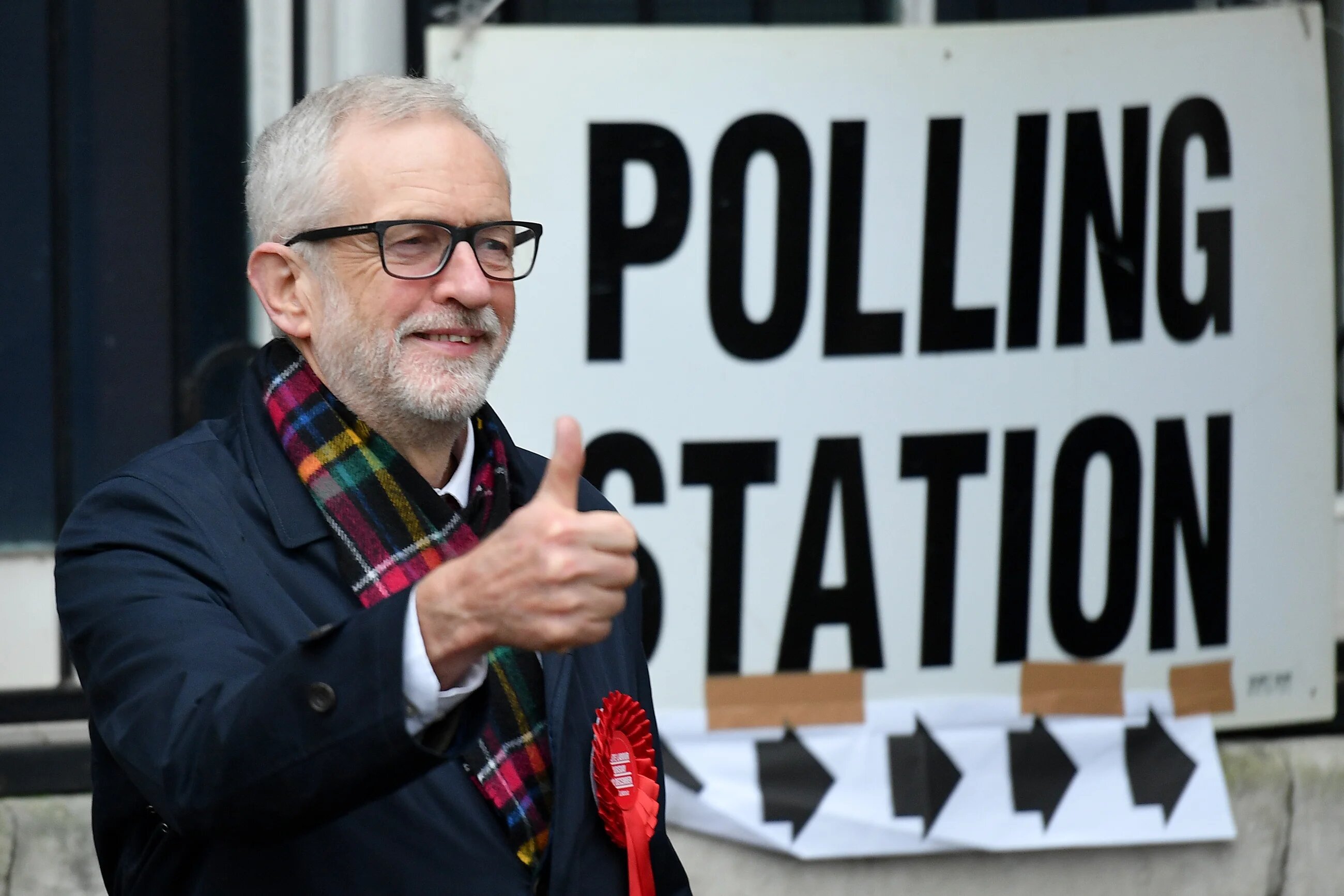 Labour Party leader Jeremy Corbyn poses as he arrive at a Polling Station to cast his ballot paper and vote, in north London on 12 December (AFP)