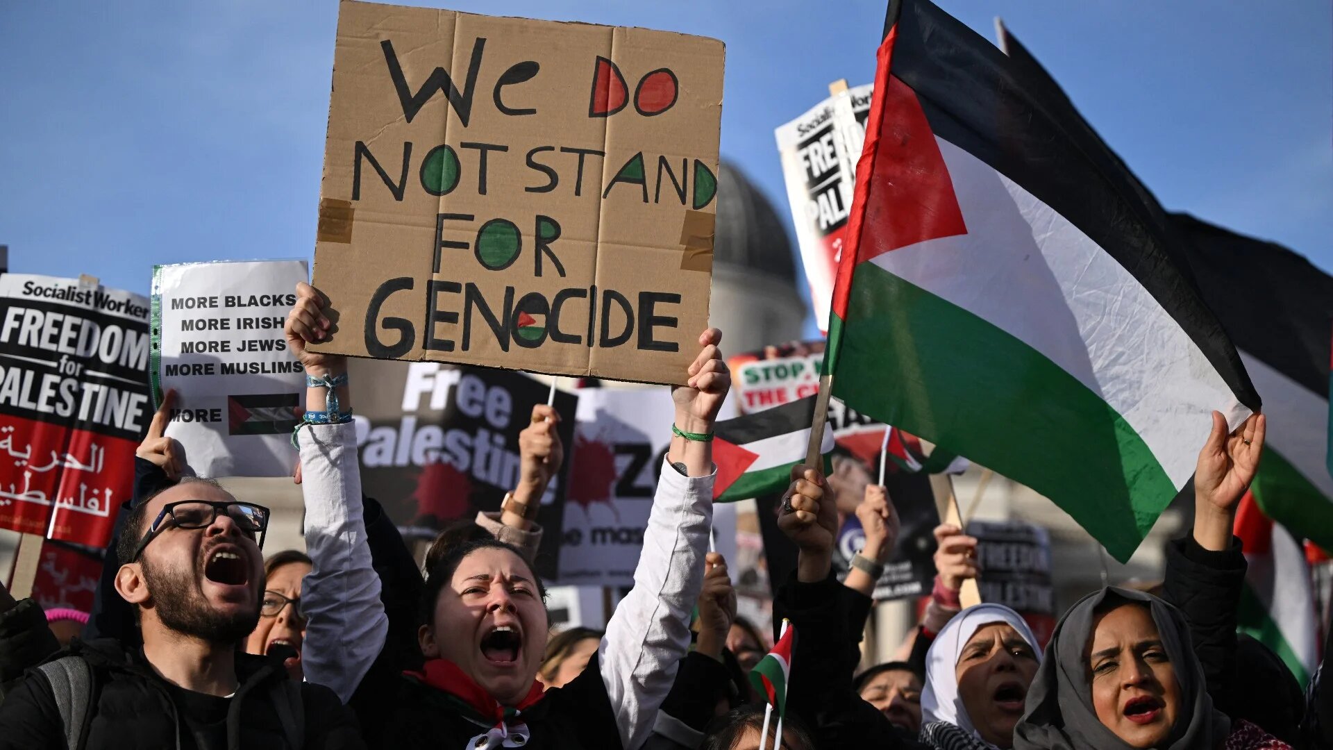 Protesters gather with placards and flags during the 'London Rally For Palestine' in Trafalgar Square, central London on 4 November 2023 (AFP)