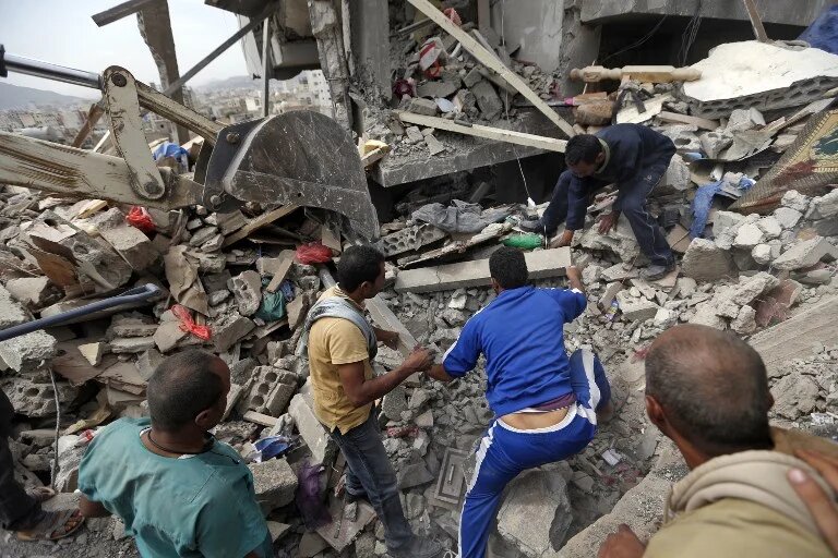 Photo: Yemenis search under the rubble of a house destroyed in an airstrike in the Faj Attan district of the capital Sanaa on 25 August 2017 (AFP)