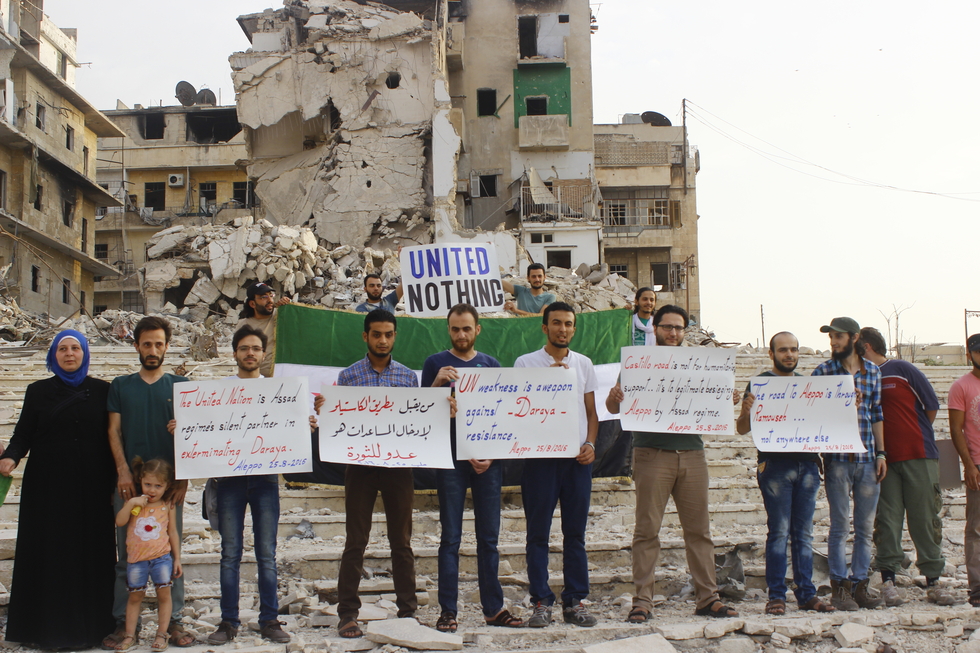 “The United Nations is the Assad regime’s silent partner in exterminating Daraya,” read a sign held up by residents in front of the bombed out remains of a house.