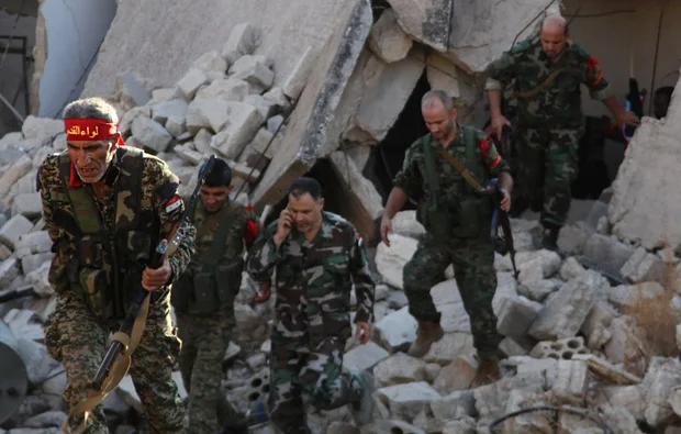 On Saturday, Syrian pro-government soldiers patrol the Uwaija neighbourhood as they advance in Aleppo's rebel-held areas (AFP)