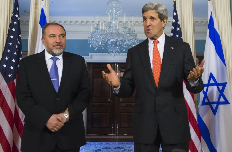 Photo credit: Secretary of State John Kerry(R) and Israeli Foreign Minister Avigdor Lieberman speak to the media prior to meetings at the State Department in April (AFP)
