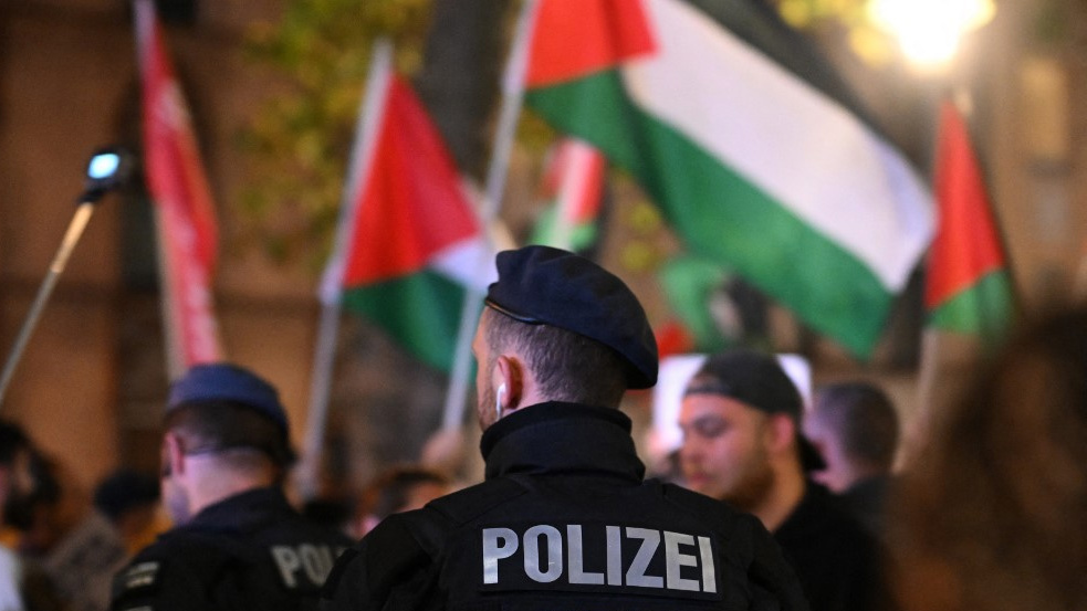 Riot police monitor a pro-Palestinian demonstration in Duisburg, western Germany, on 9 October 2023 (Ina Fassbender/AFP)