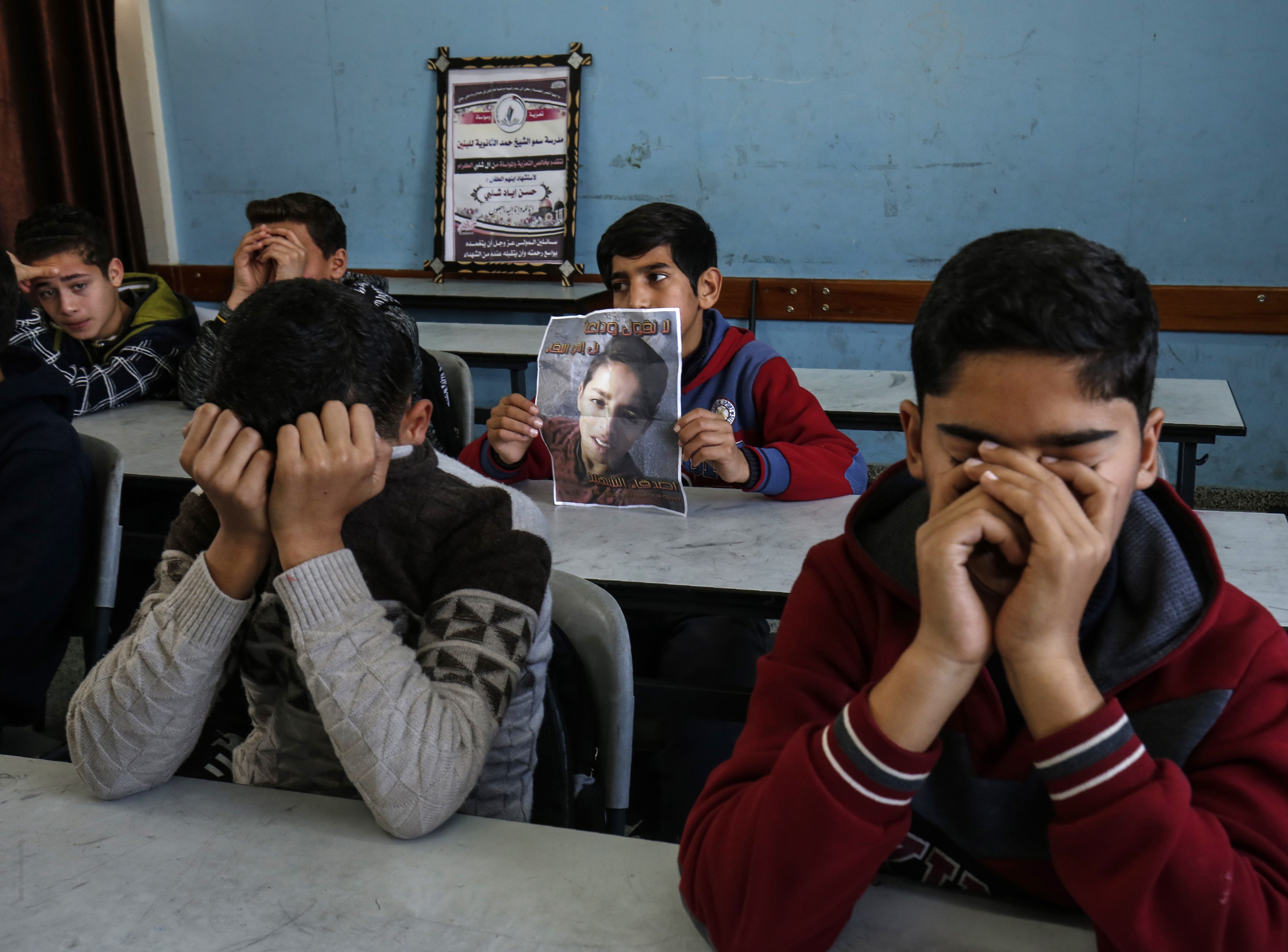 Classmates of Hassan Shalabi, 14, mourn his death at his school in Khan Younis in the southern Gaza Strip, on 9 February (AFP)