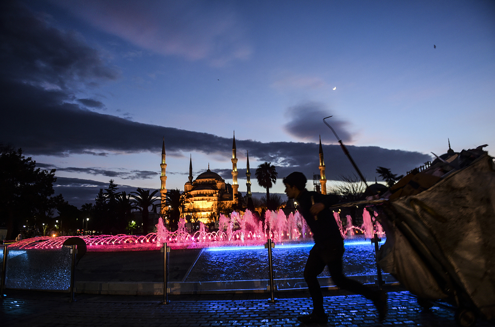 Photo: A man collecting paper pulls a cart past the Ottoman-era Blue Mosque in Istanbul's tourist hub of Sultanahmet on 12 January, 2016 (AFP).