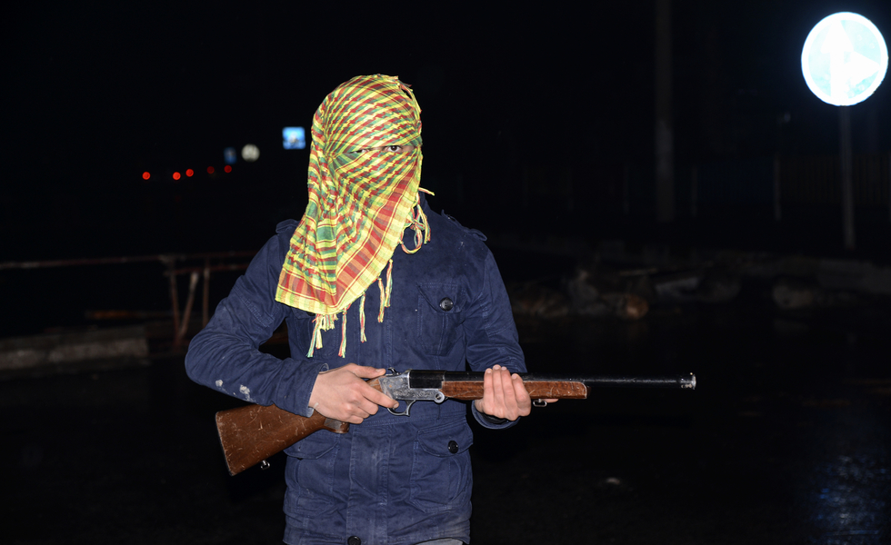 A member of PKK (Kurdistan Workers Party) blocks the road at Cizre, in southeast Turkey near the Syrian border on 27 December 2014 (AFP).
