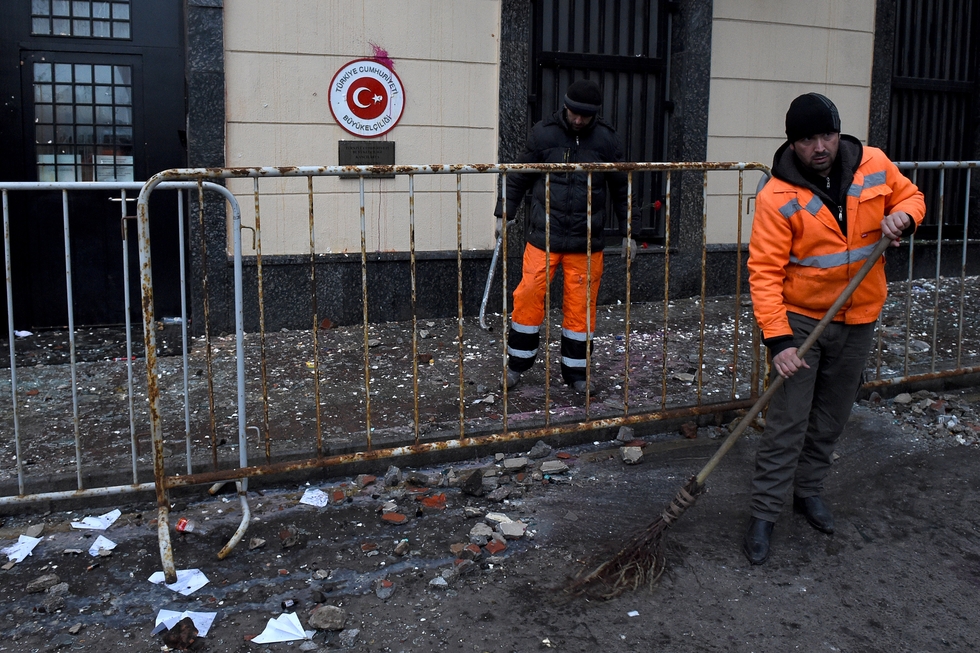 Photo: Municipal workers collect broken glass and debris in front of the Turkish embassy in Moscow on 25 November, 2015 after an anti-Turkey demonstration (AFP).