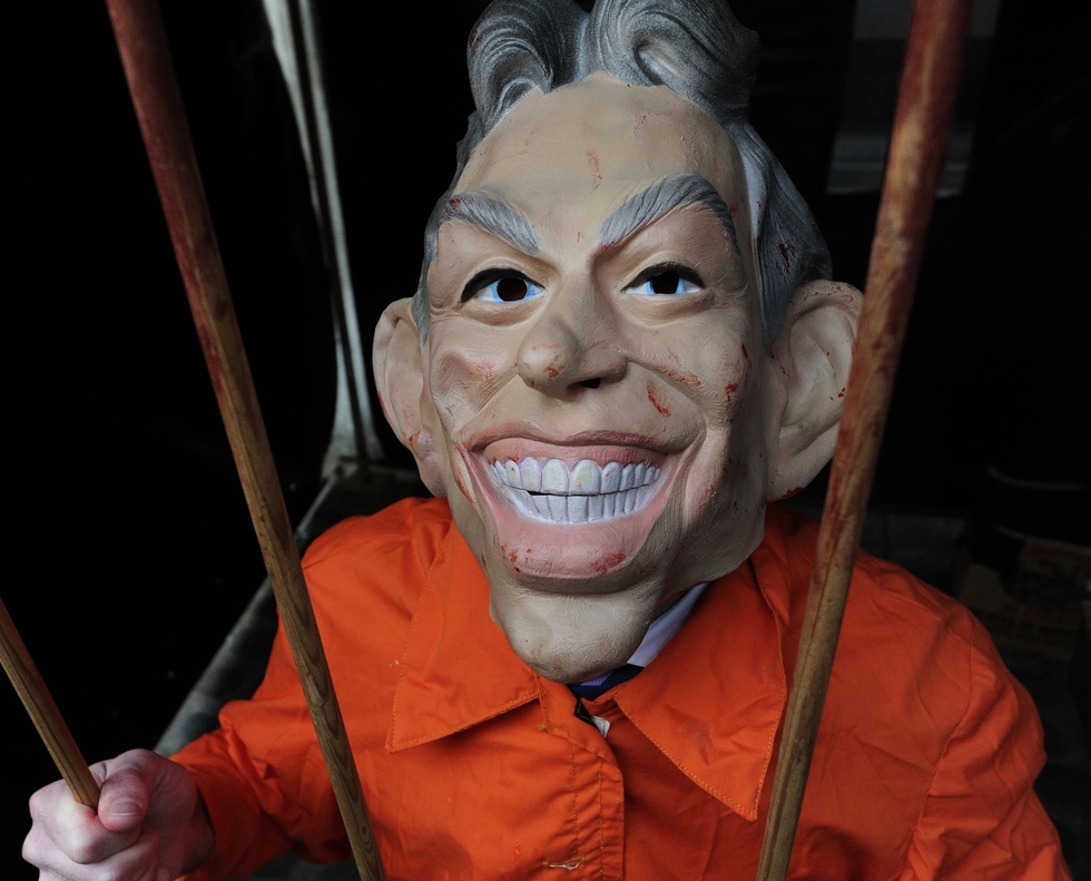 Photo: An anti-war protestor wears a mask of former British Prime Minister Tony Blair as he stands in a mock prison cell outside the Queen Elizabeth II Conference Centre in central London, on 21 January, 2011 (AFP).