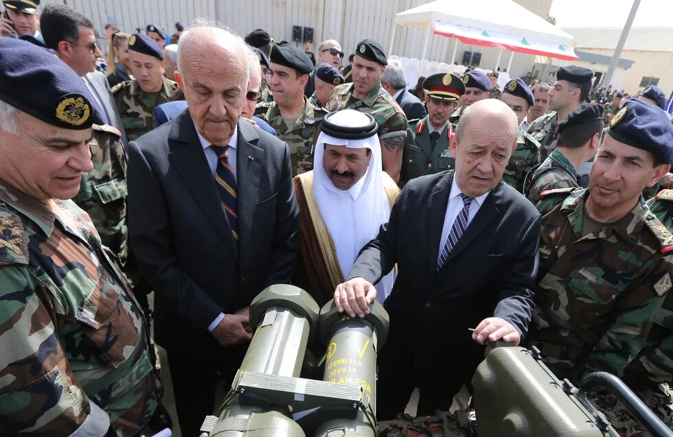Photo: (L to R) Lebanese Army chief Jean General Jean Kahwaji, Lebanese Defence Minister Samir Moqbel, Saudi Ambassador to Lebanon Ali Awad Asiri and French Defence minister Jean-Yves Le Drian take part in a hand-over ceremony of a shipment of Saudi-funded French weapons to the Lebanese Army at Beirut International Airport on 20 April, 2015 (AFP).