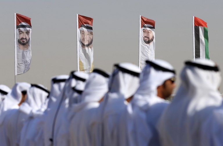 Photo: Emirati men perform a traditional dance in front of flags bearing portraits of Abu Dhabi's Crown Prince Sheikh Mohammed bin Zayed al-Nahyan (L), Sheikh Sultan Bin Zayed al-Nahyan (C), UAE President Sheikh Khalifa bin Zayed Al-Nahyan (R) during the Sheikh Sultan Bin Zayed al-Nahyan heritage festival, held at the Sweihan racecourse in Al-Ain in February 2016. (AFP)