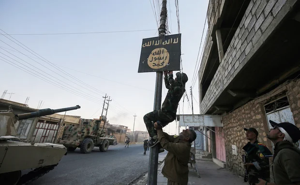 Iraq soldiers remove an IS flag in Tal Afar, west of Mosul (AFP)