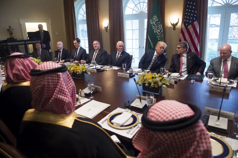 Photo: President Donald Trump olds a lunch meeting with Saudi Arabia's Crown Prince Mohammed bin Salman, and members of his delegation, in the Cabinet Room of the White House in Washington, DC, on 20 March, 2018 (AFP)