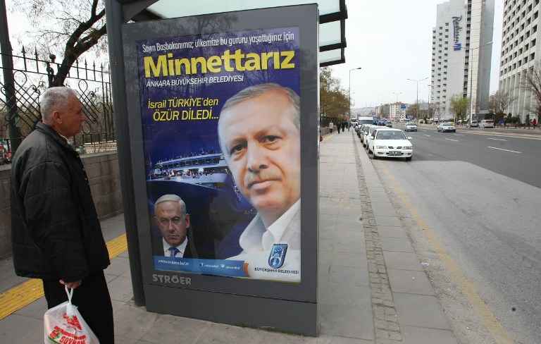 Photo: A billboard on a main street by the Ankara municipality to thank the then Turkish Prime Minister, currently President Recep Tayyip Erdogan reads: "We are grateful to you" in Ankara, on 25 March, 2013, three days after Israeli Prime Minister Benjamin Netanyahu apologized to Turkey over the death of nine Turkish citizens on board a Gaza-bound flotilla in 2010 (AFP).