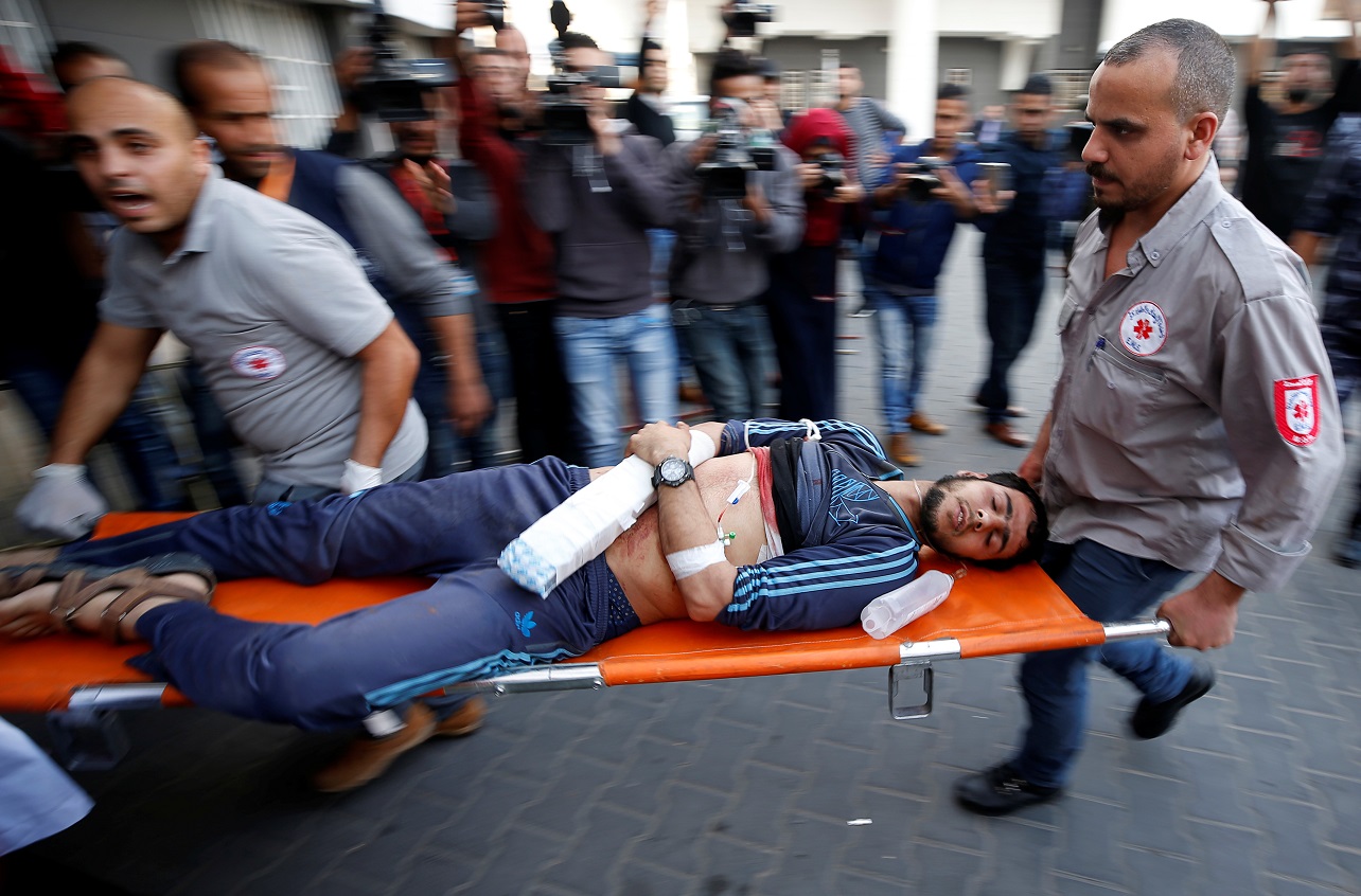 Photo: A Palestinian wounded at the Israel-Gaza border is carried into a hospital in Gaza City on 27 April 2018 (Reuters)