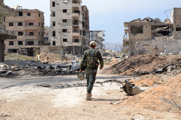 Photo: A Syrian government soldier walks past destroyed buildings in the former rebel-held town of Jobar in Eastern Ghouta on 1 April 2018 (AFP)