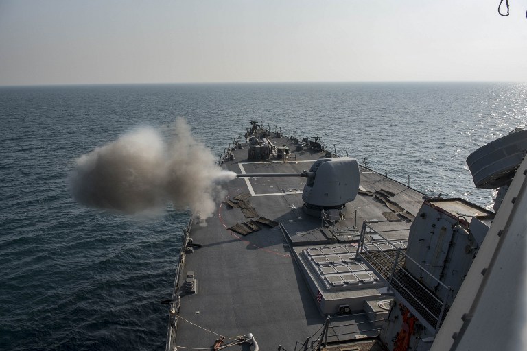 Photo: This US Navy handout photo, obtained on 26 April 2017, shows The Arleigh Burke-class guided-missile destroyer USS Mahan (DDG 72) as it fires its Mark 45 5-inch gun during a pre-action calibration firing on 11 January 2017 in the Gulf. Mahan is part of the George H.W. Bush Carrier Strike Group, which is deployed to the US 5th Fleet area of operations in support of maritime security operations designed to reassure allies and partners, preserve the freedom of navigation and the free flow of commerce in the region. A US warship has fired a warning flare at an Iranian Revolutionary Guards vessel that refused to maintain distance in Gulf waters, a US spokesman said 26 April 2017 (AFP)