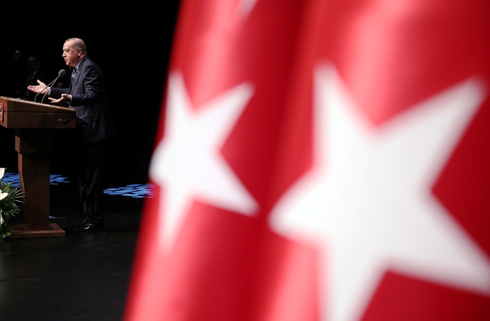 Photo: Turkish President Tayyip Erdogan addresses the audience during a meeting at the Presidential Palace in Ankara, Turkey on 21 February, 2018 (REUTERS)