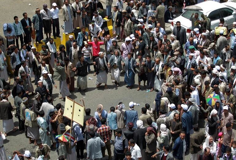 Photo: Supporters of the Shiite Houthi movement block a road during a demonstration rejecting the presidential overture to replace the government and reduce a disputed fuel price hike in Sana'a on 3 September 2014 (AFP)