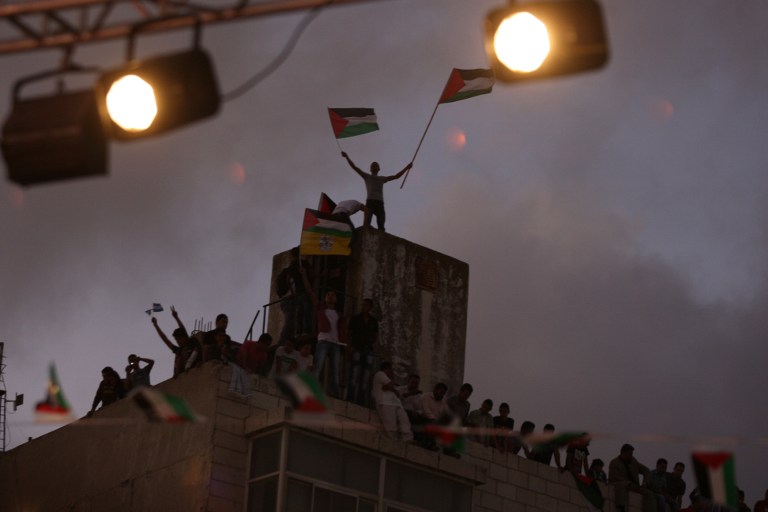 Photo: Palestinians wave national flags as they gather on the roof of a building to watch a wide screen relaying live footage of Palestinian Authority President Mahmud Abbas' speech at the United Nations General Assembly in New York, making a historic bid for statehood on 23 September 2011 in the West Bank city of Ramalla (AFP)