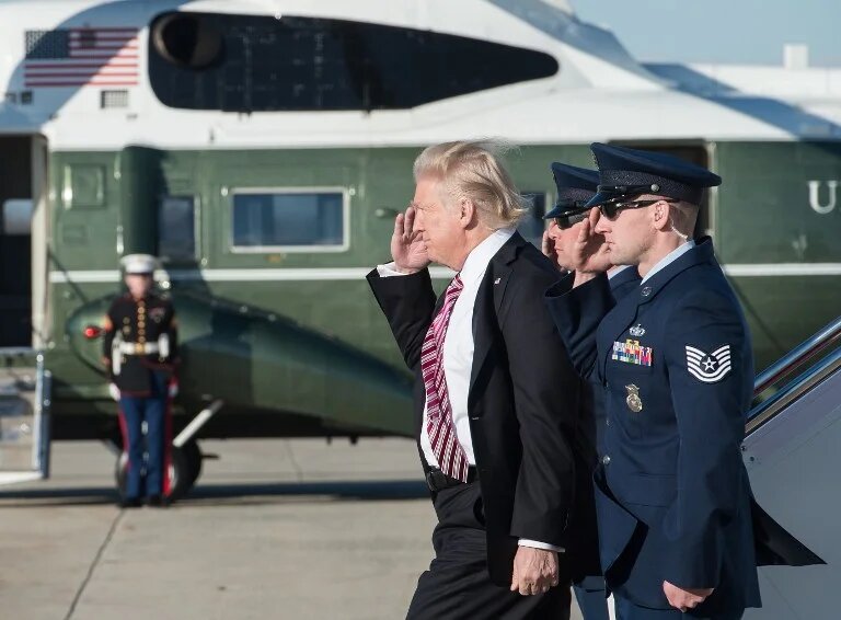 Image: US President Donald Trump salutes as he steps off Air Force One at Andrews Air Force Base in Maryland upon his return from Philadelphia on 26 January, 2017 (AFP)