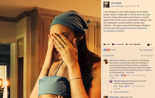 Second, the fact that Gadot has served in the Israeli army should be a given, considering all Israelis have to serve, men for three years, women for two. There are few exceptions, based on mental illness, physical disability, or religious grounds (ultra-Orthodox Jews are exempt). Clearly, Gadot is not exempt. She is also obviously not a conscientious objector. In fact, there is evidence on social media that she is an ardent Zionist, totally imbued with anti-Palestinian hatred, and a fan of the army (“You learn to discipline and respect,” she claims, with no mention of the fact that it also brainwashes soldiers into racism and unquestioning murderous violence).