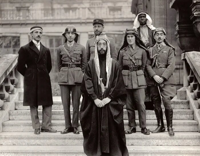 Photo: The Arabian delegation to the Paris Peace Conference in early 1919 included Emir Faisal Hussein, later the British-backed king of Iraq, and TE Lawrence, third from left (public domain)
