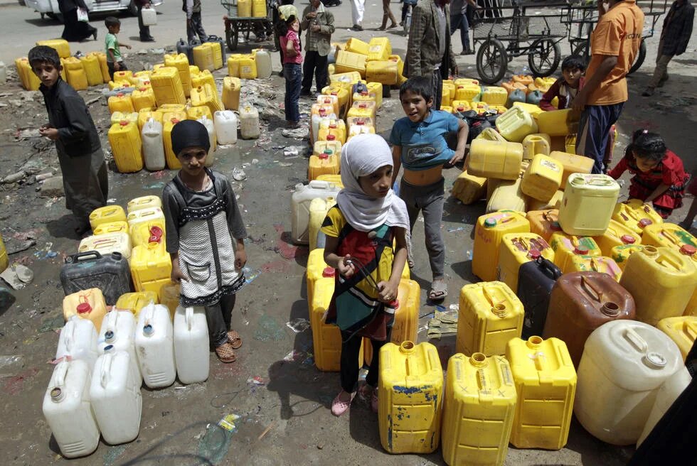 Photo:Yemeni children wait to fill their jerrycans with water from a public tap amid an acute shortage of water supply. (AFP)