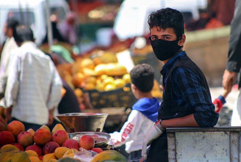 A Yemeni youth wearing a protective mask sells fruit at a street market in Taiz on 1 June (AFP)