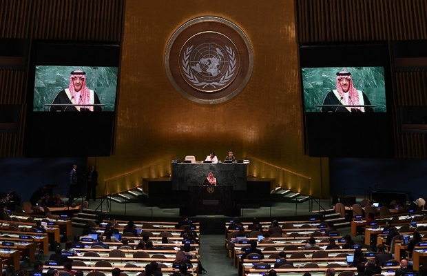 Photo : New York le 21 Septembre 2016 : Le Prince héritier d’Arabie saoudite, Mohammed ben Nayef ben Abdelaziz Al-Saoud, pendant son discours devant la 71e session de l’Assemblée générale des Nations unies au siège de l’ONU (AFP).