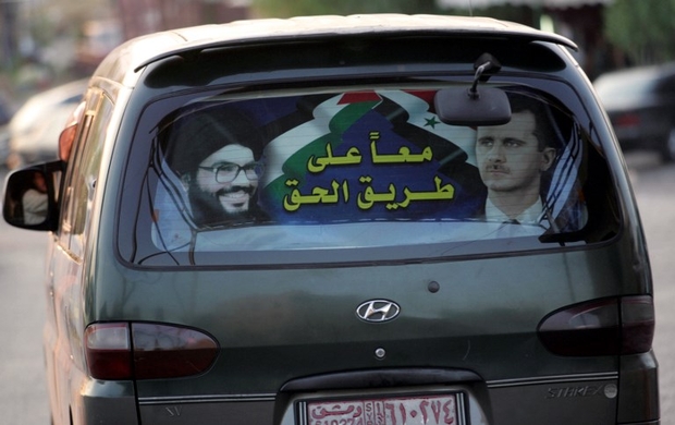 Photo : un véhicule syrien dont la vitre est recouverte d’une affiche représentant le chef du Hezbollah Hassan Nasrallah et le président syrien Bachar al-Assad arrive au poste frontalier de Masnaa, à la frontière libano-syrienne, dans la vallée de la Bekaa (AFP).
