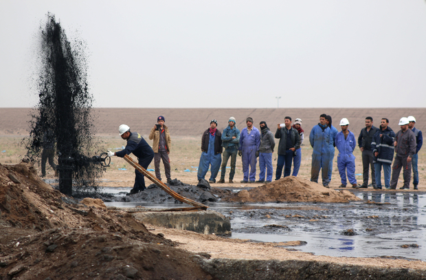 Photo : des ouvriers de la South Oil Company regardent un oléoduc expulser du pétrole lors de l’ouverture par la compagnie de deux puits sur le gisement de Tuba, à l’ouest de Basra, la deuxième plus grande ville d’Irak, le 19 février 2015 (AFP).