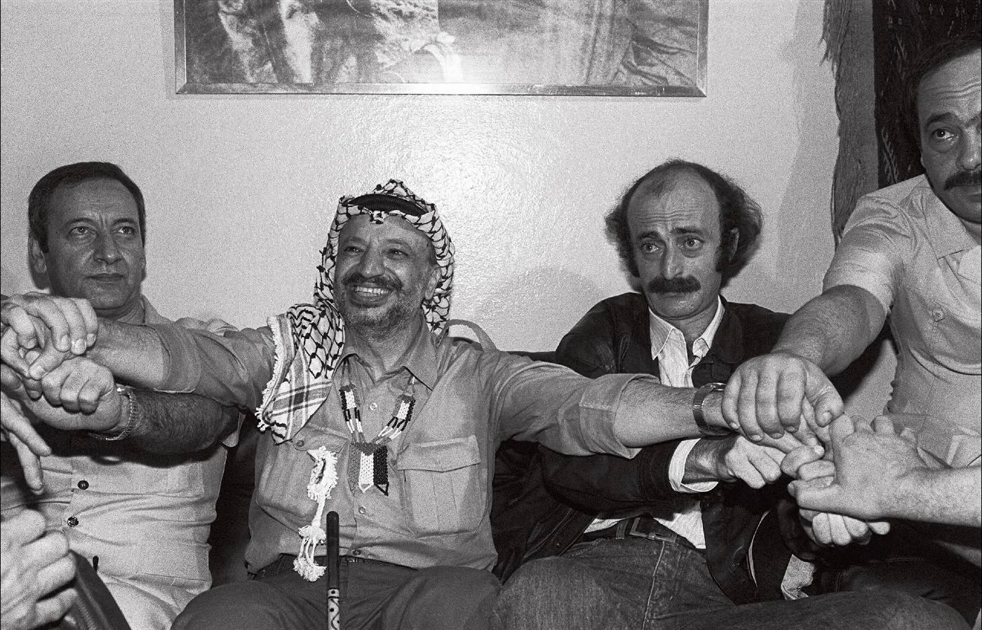 PLO chairman Yasser Arafat (centre) shakes hands with his Lebanese supporters Nabih Berri (left) and Walid Jumblatt (second right) before leaving Beirut in August 1982 (AFP)
