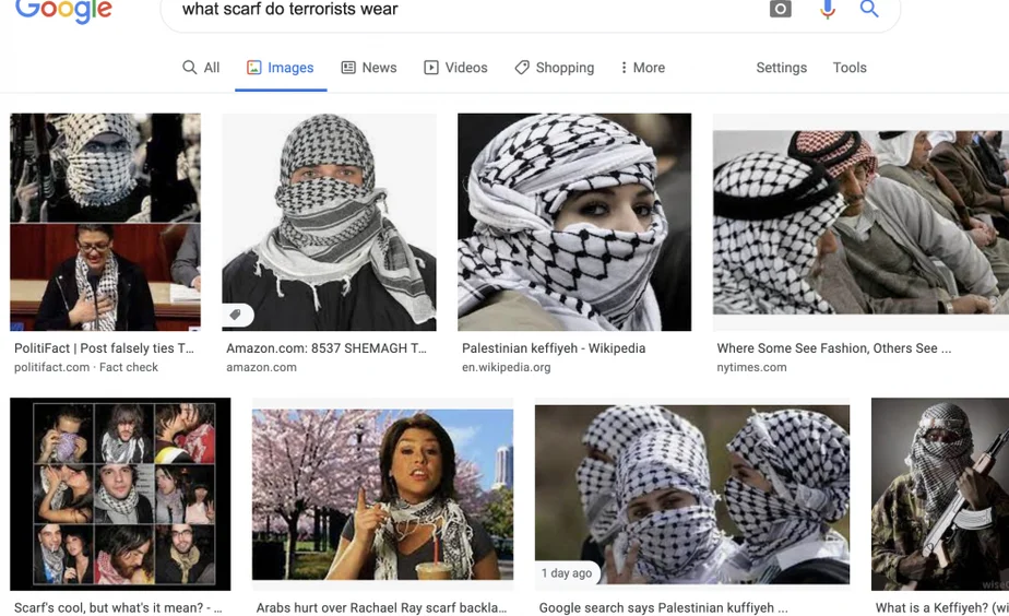 Google search results suggest Palestinian keffiyeh a symbol of terrorism
