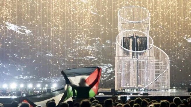 While many waved Palestinian flags, British protestors from the organisation, Youth Demand, attempted to storm the stage, in protest against Israel, while Raphael sang before they said they were "assaulted" by security as they stopped the disruption.
