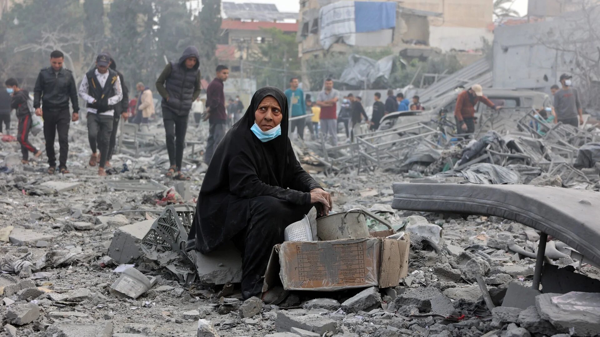 A video posted by Nour, a woman from Gaza, shows an Israeli strike on a building nearby amidst an entirely destroyed neighbourhood as a woman sobs in the background.