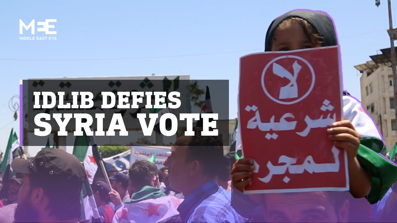 As Bashar al-Assad shows up to vote at the site of state chemical attacks in Douma, protesters in the rebel-held Idlib send him a message of defiance in the country’s first presidential elections since 2014.