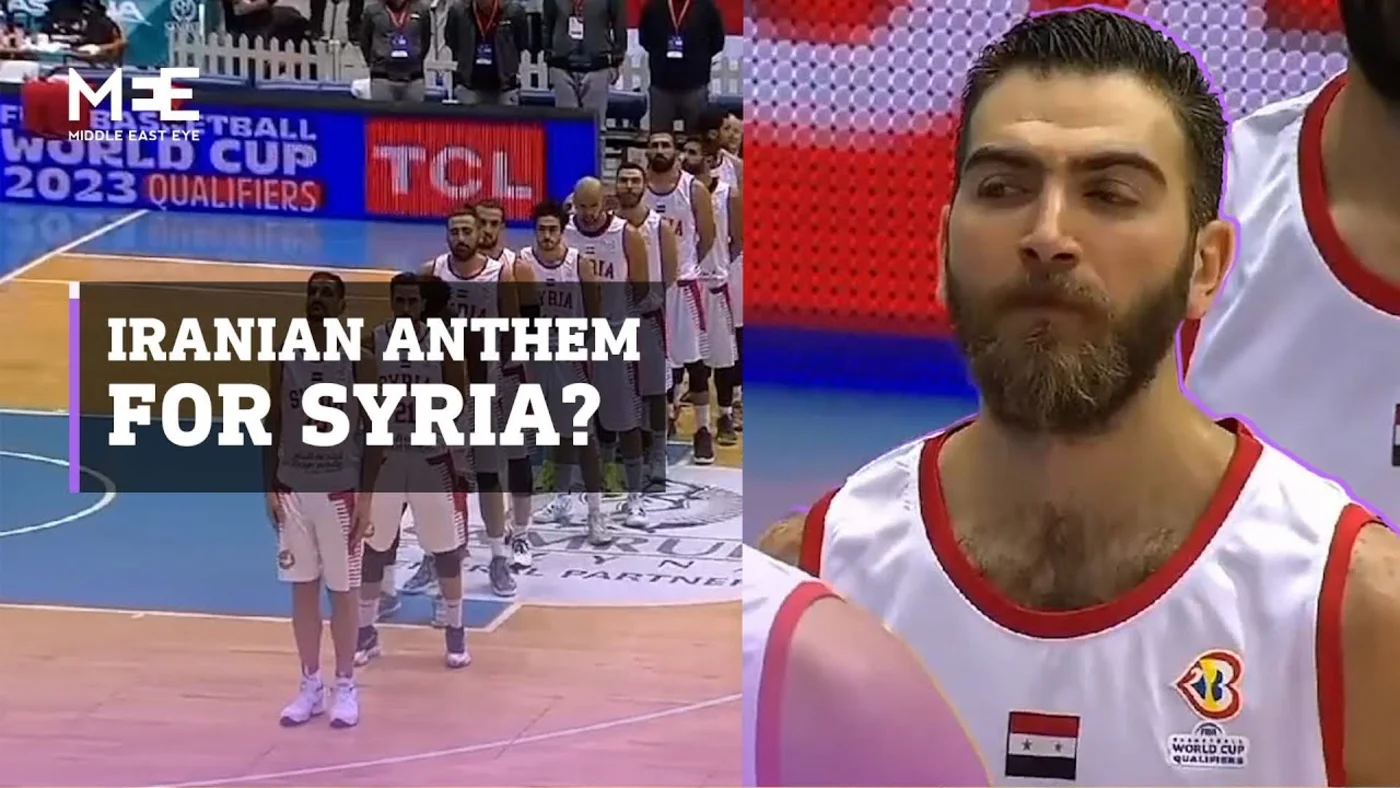 The Syrian basketball team players stood bemused as the wrong anthem was played by their Kazakh hosts, in a mistake that caused an uproar online