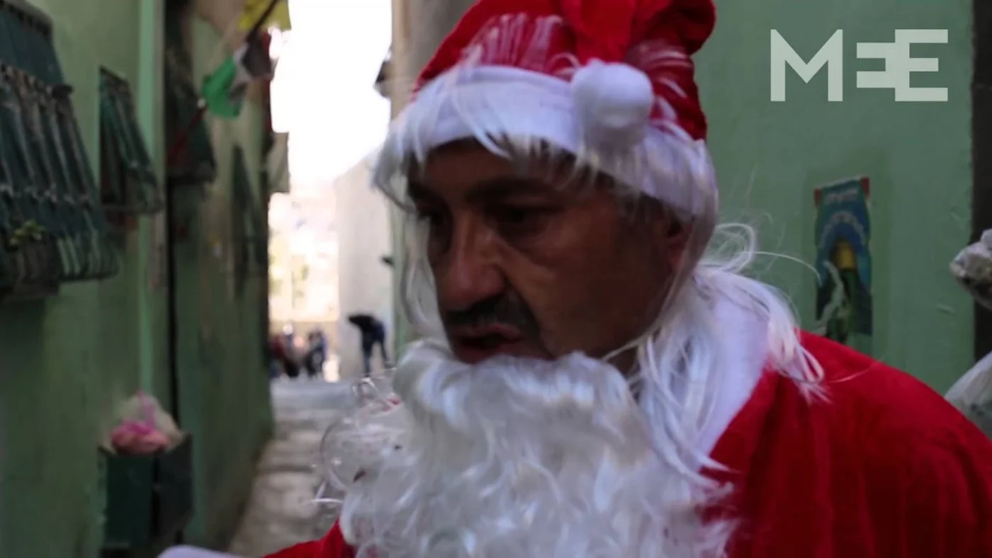 Palestinian Christians dressed as Santa Claus march against Israeli occupation