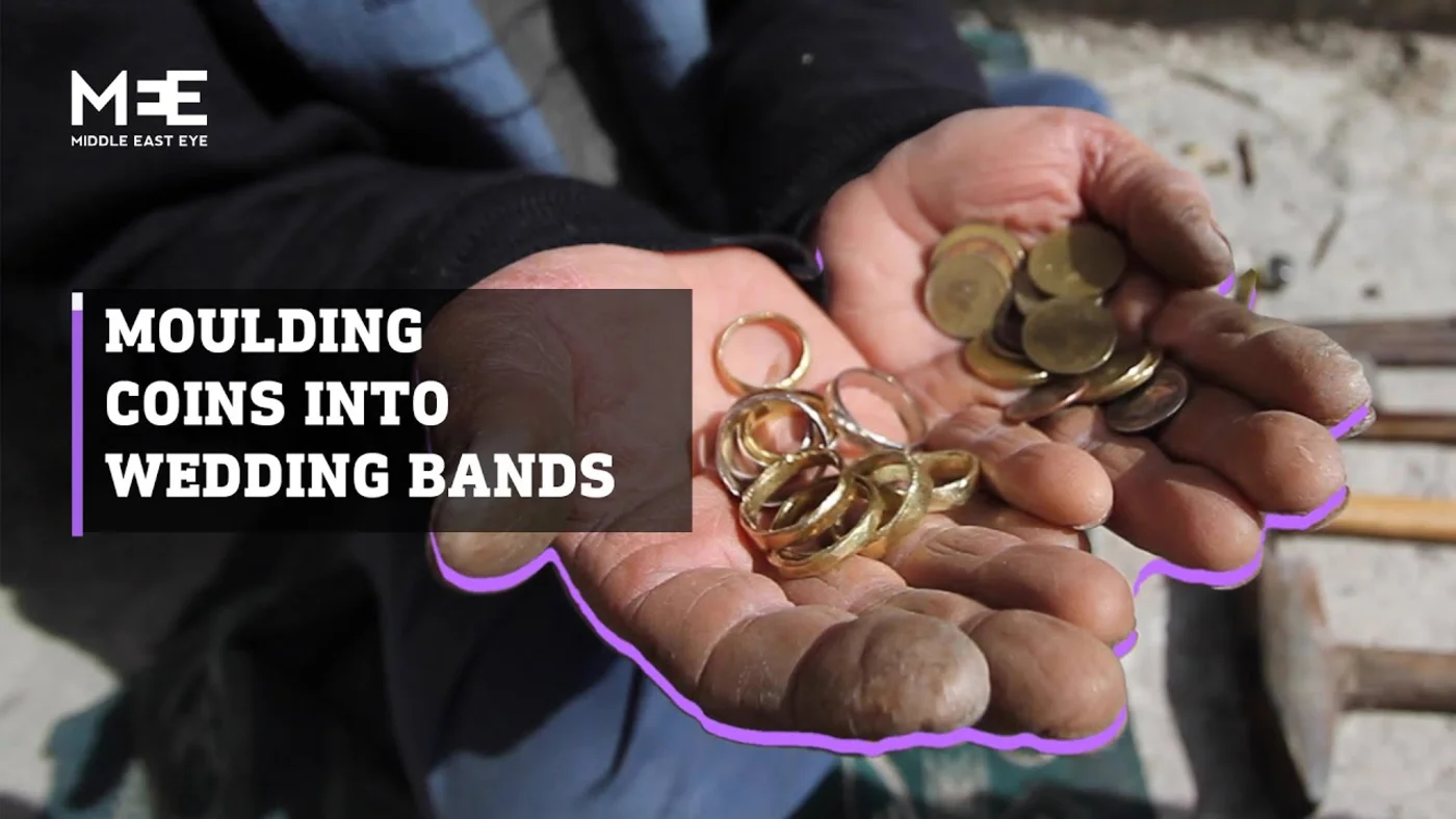 Syrian blacksmith moulds old coins into wedding bands