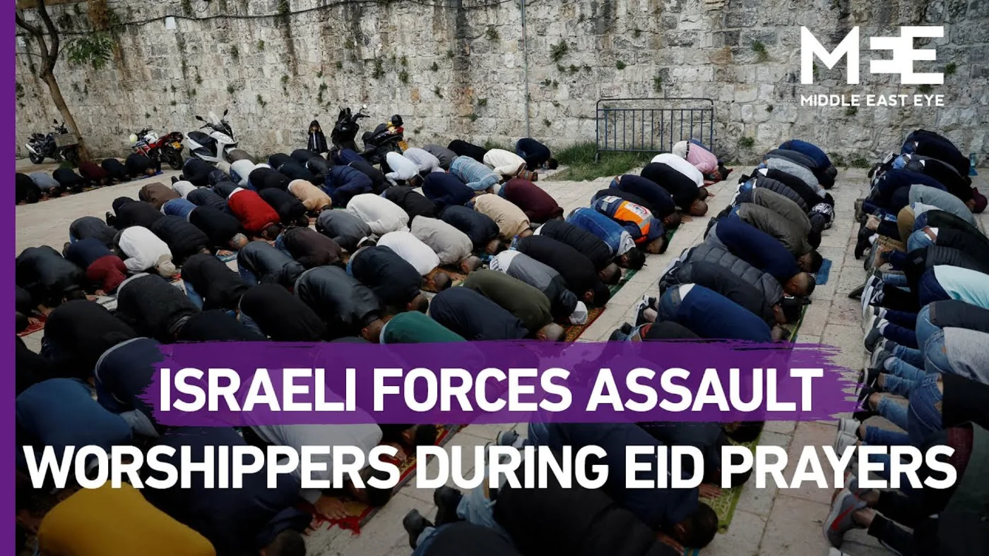 Israeli forces assaulted Palestinian worshippers outside Al-Aqsa Mosque this morning, after they were barred from entering the compound to join Eid prayers.