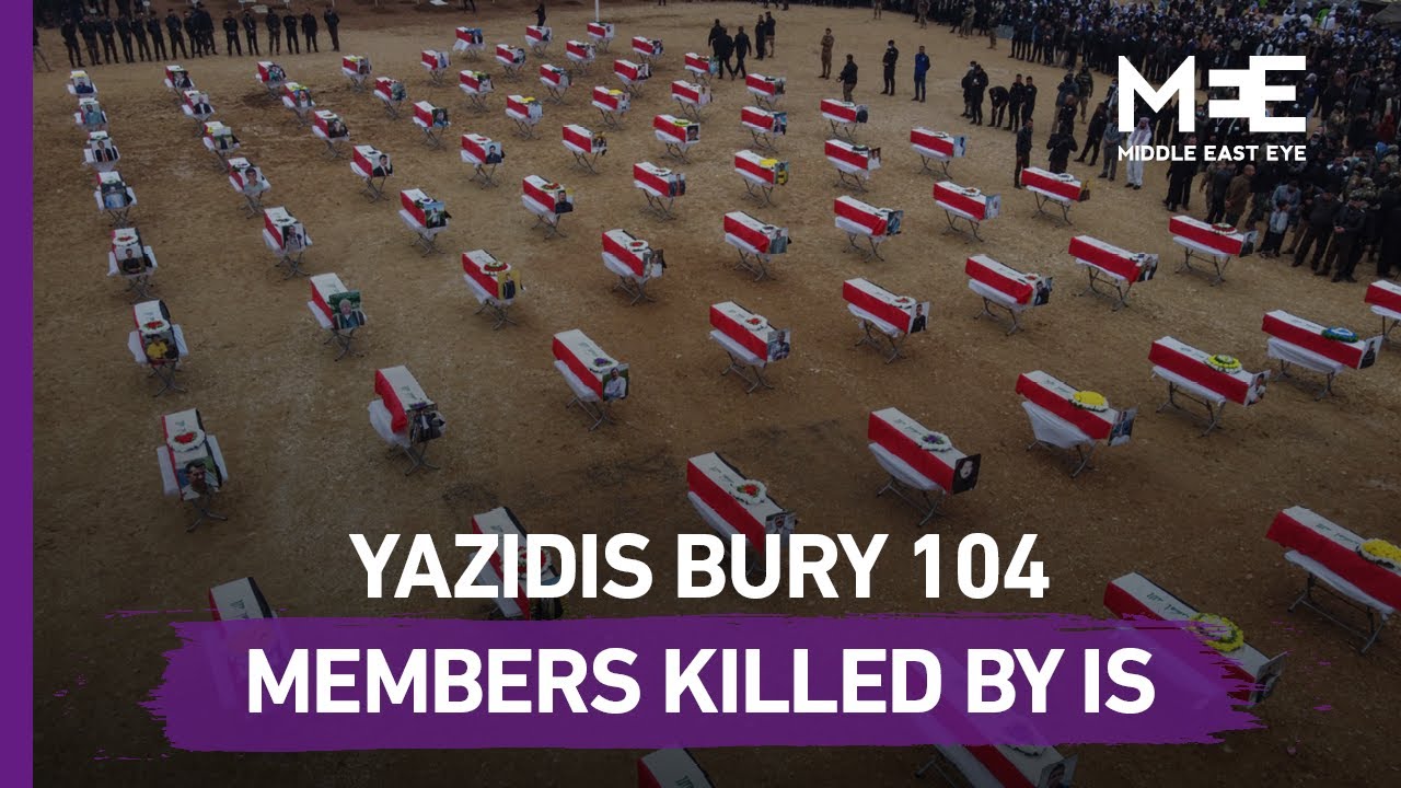The remains of 104 Yazidis killed by the Islamic State group in 2014 were laid to rest in a mass funeral held by the Yazidi community in Iraq on Saturday.